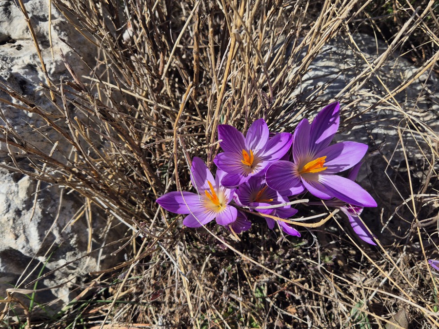 Dès les premiers pas, la montée s’installe progressivement : un effort régulier mais jamais brutal. Le sentier, encore humide des dernières pluies, s’ouvre soudain sur un spectacle délicat : un tapis de crocus violets et blancs, éclatants sous la lumière du matin.