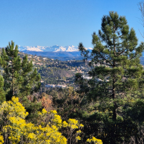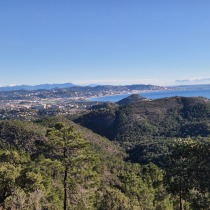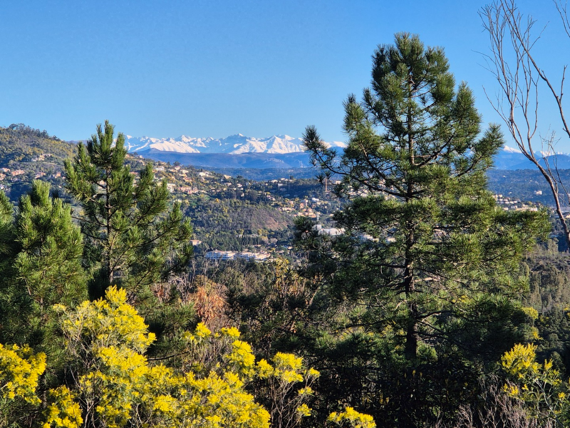 crêtes enneigées du Mercantour et la baie de Théoule. On a beau